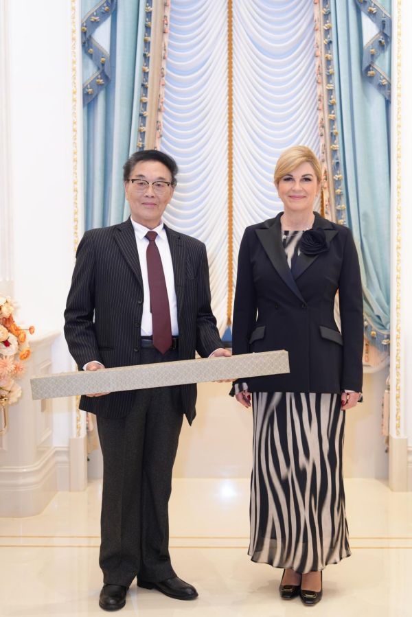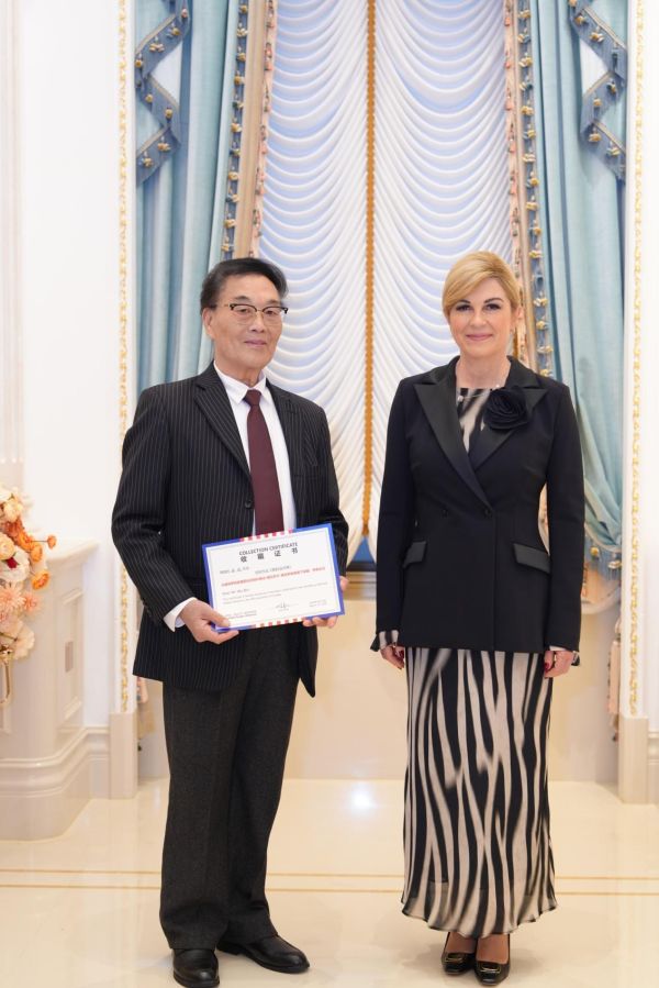 (克罗地亚首任女总统科琳达给书法家吴斌颁发收藏证书)
