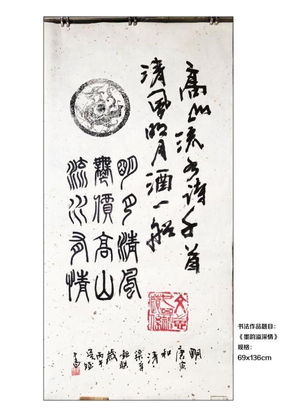 《墨韵溢深情》,"墨韵"是外在的"形","溢深情"是作品的"魂"。作品中的大金石印章,就明确点出"文之所思其神远系".